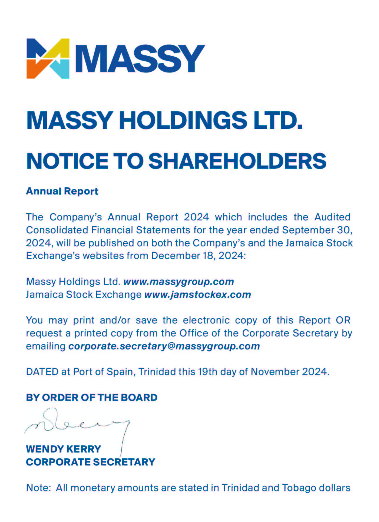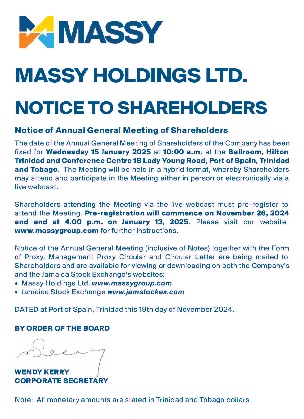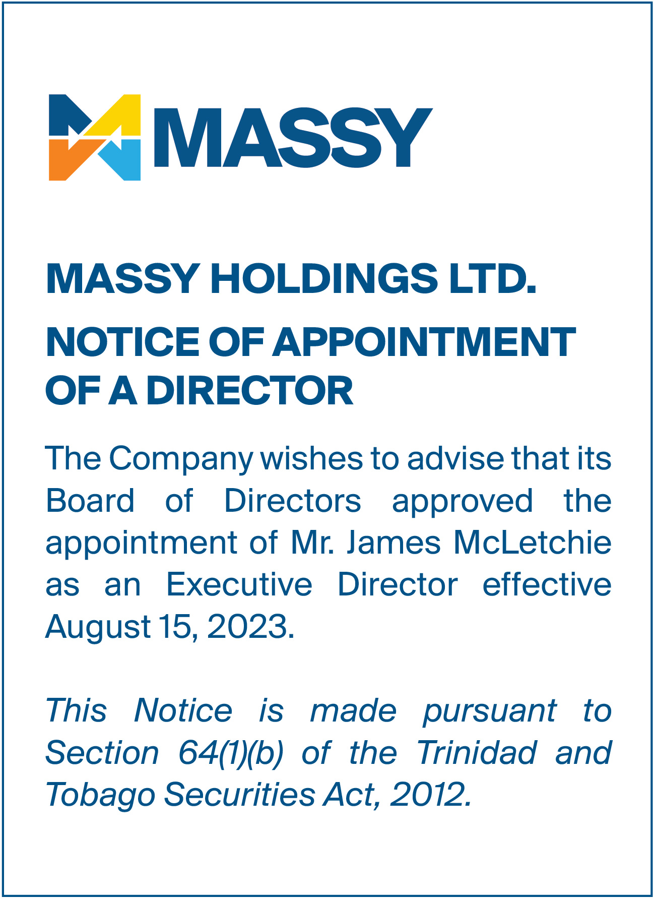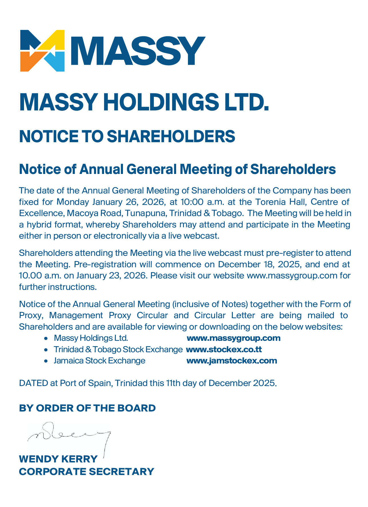Notice to Shareholders – Cross-Listing of Massy Holdings Ltd.’s shares on the Jamaica Stock Exchange