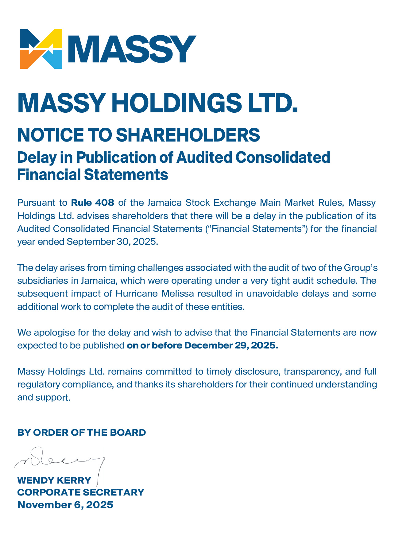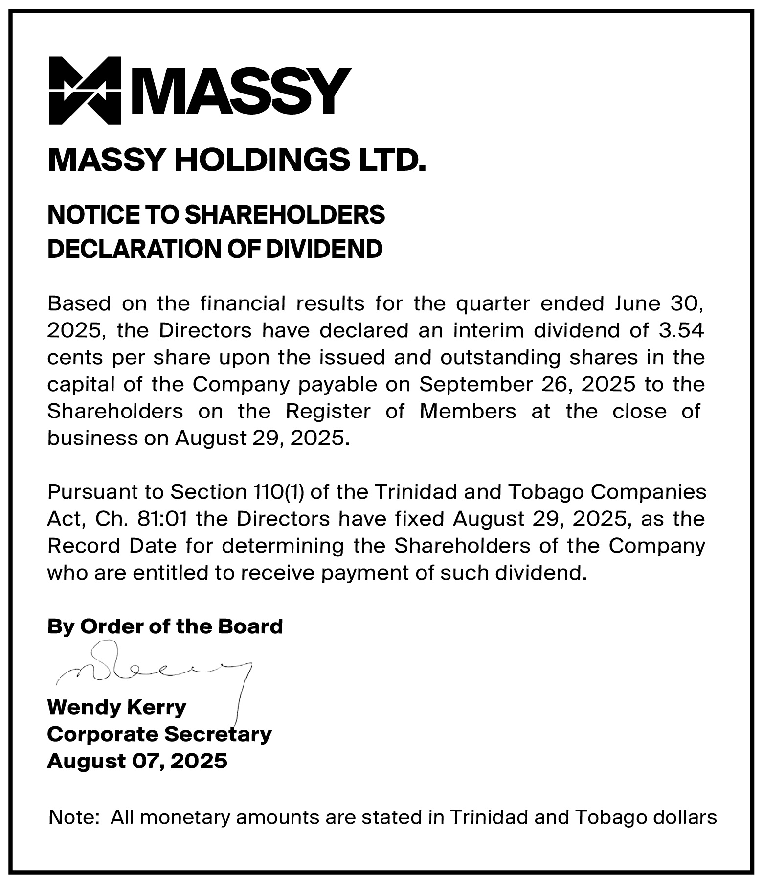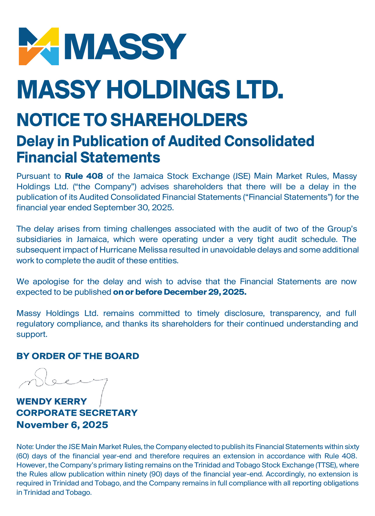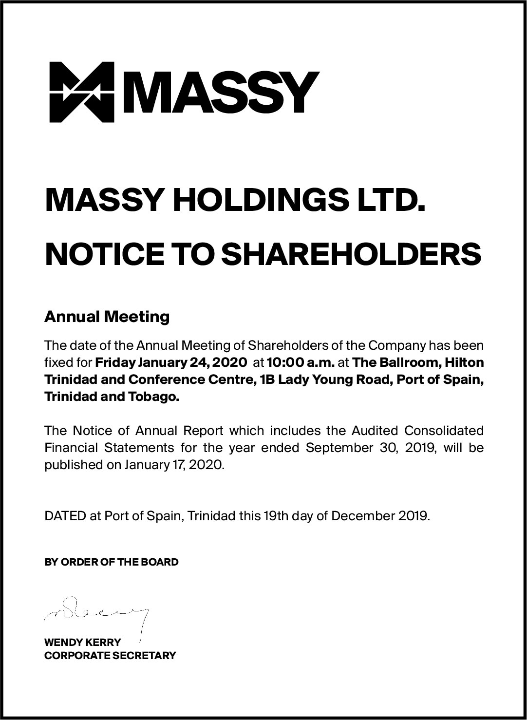 Notice to Shareholders – Cross-Listing of Massy Holdings Ltd.’s shares on the Jamaica Stock Exchange