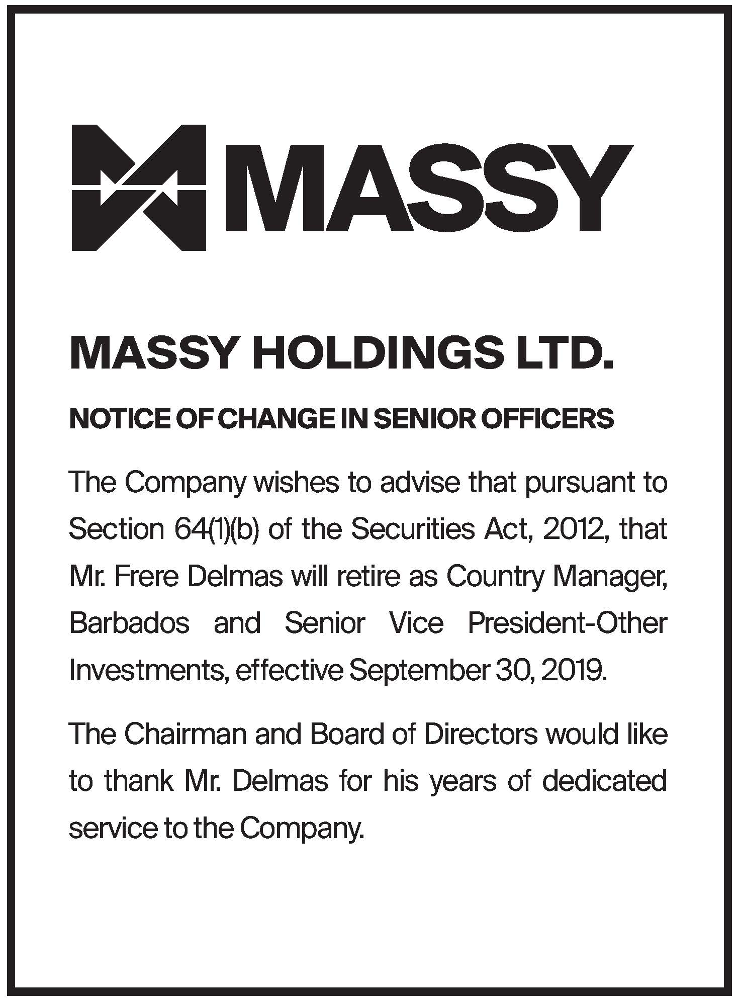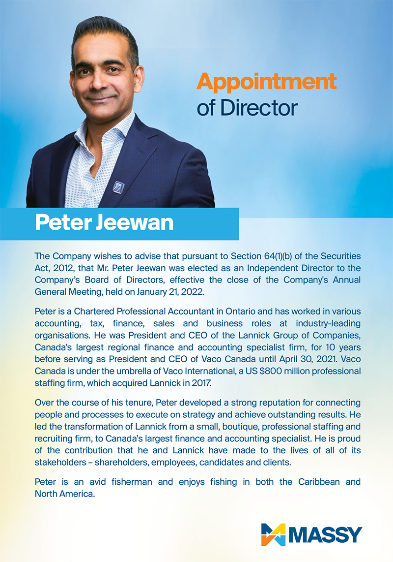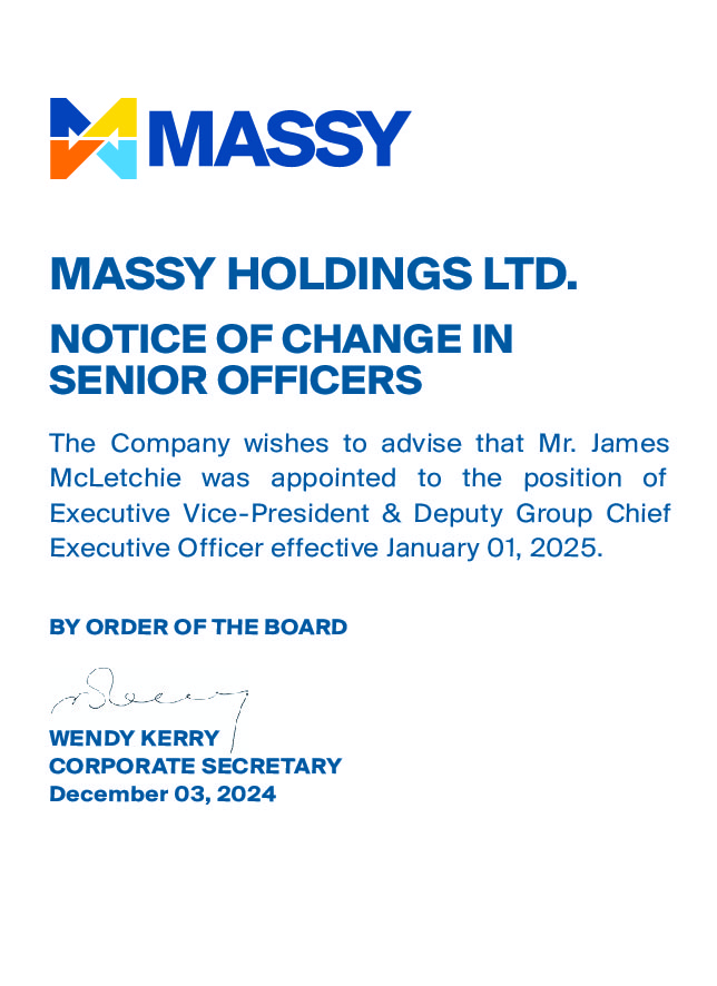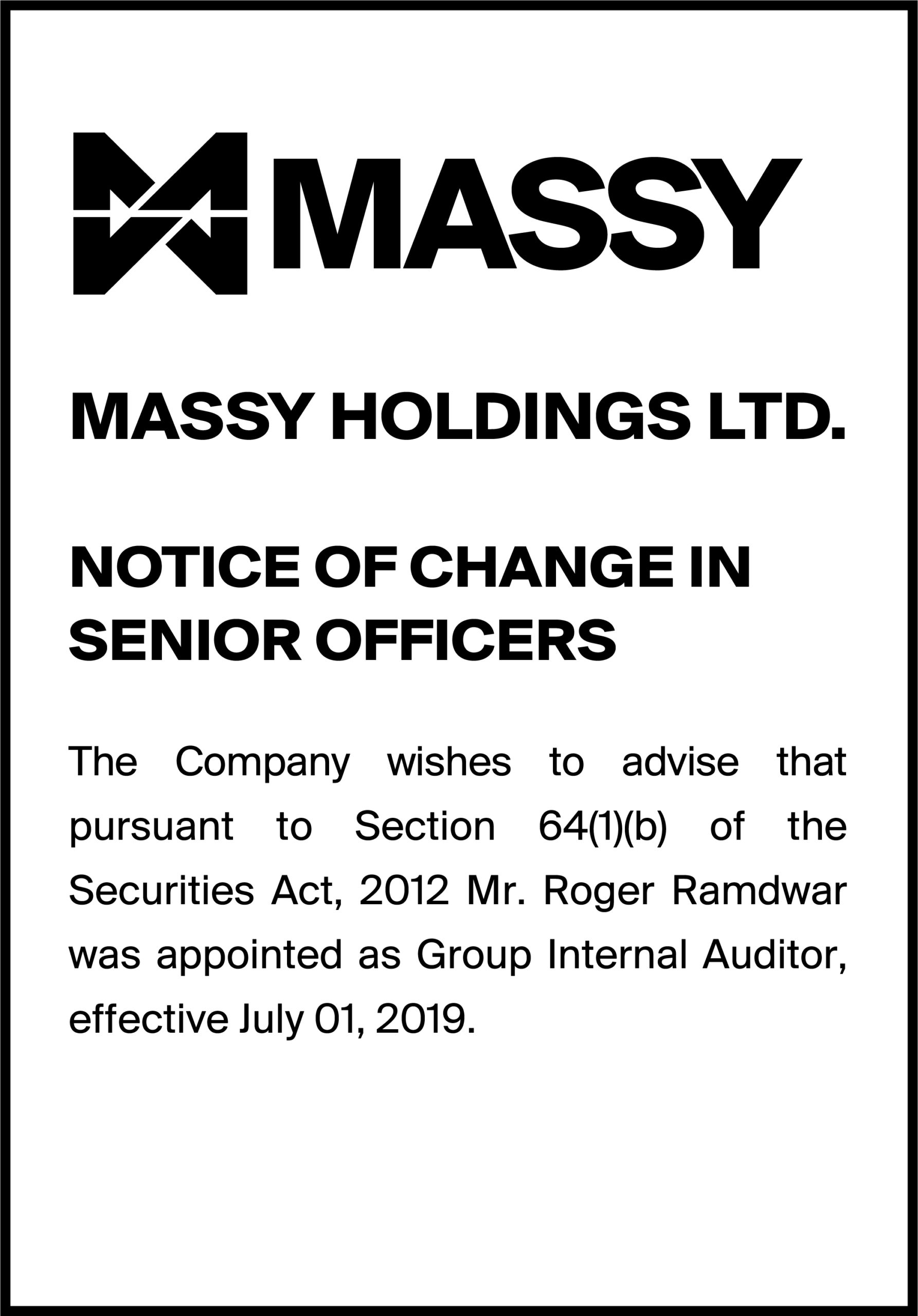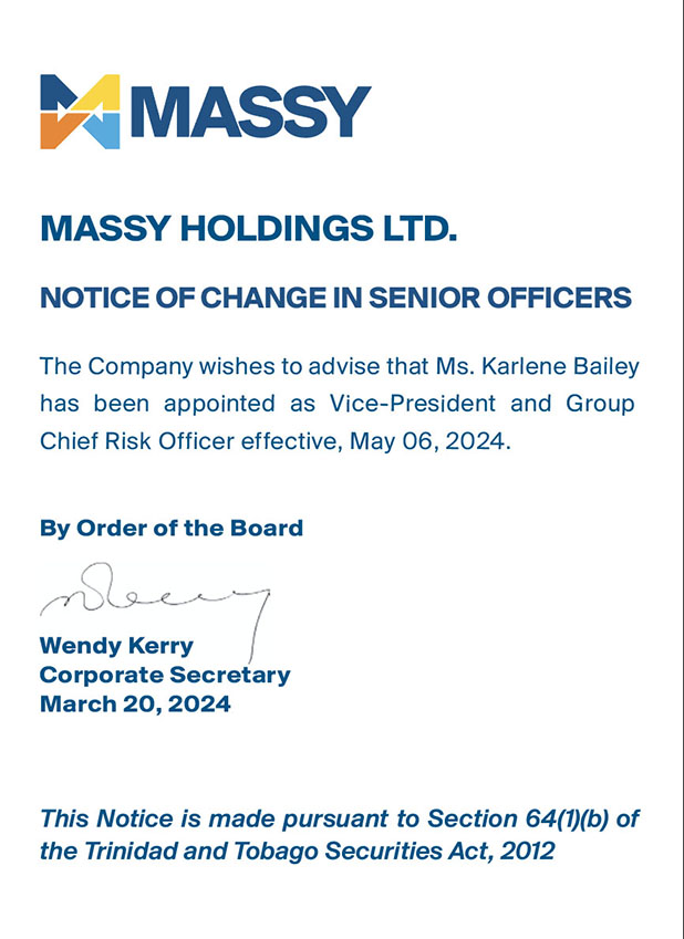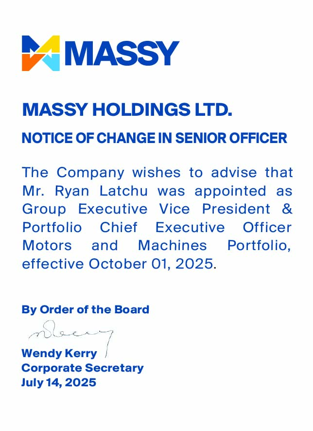 Massy Holdings Change in Senior Officer – Peter Graham