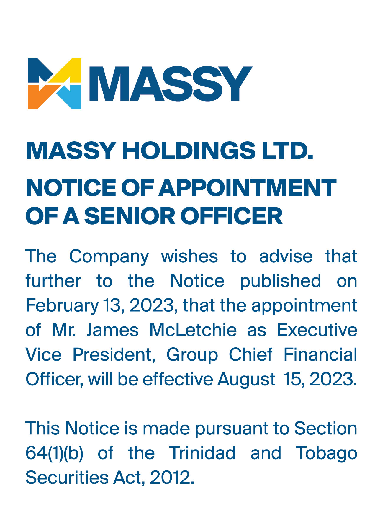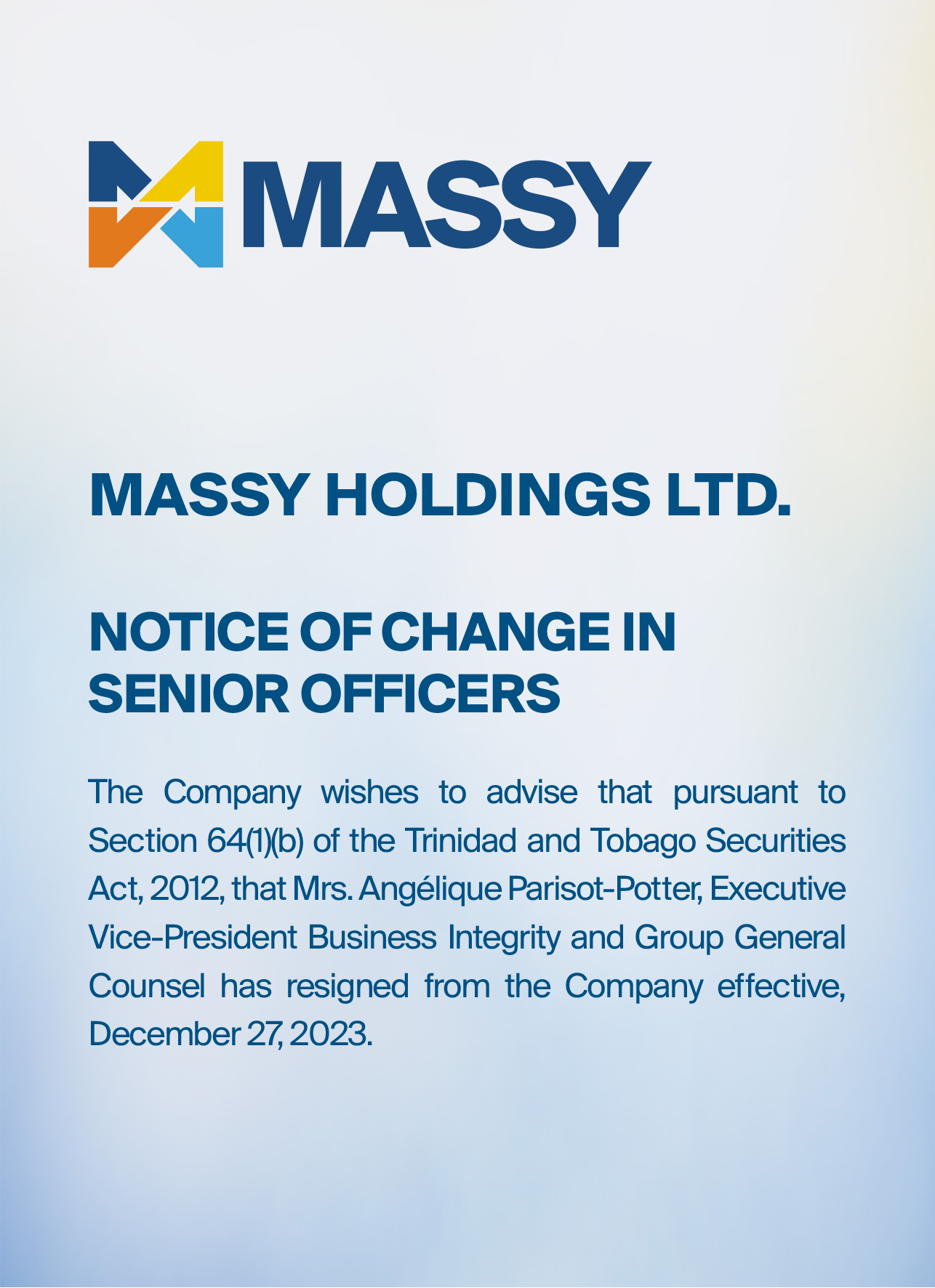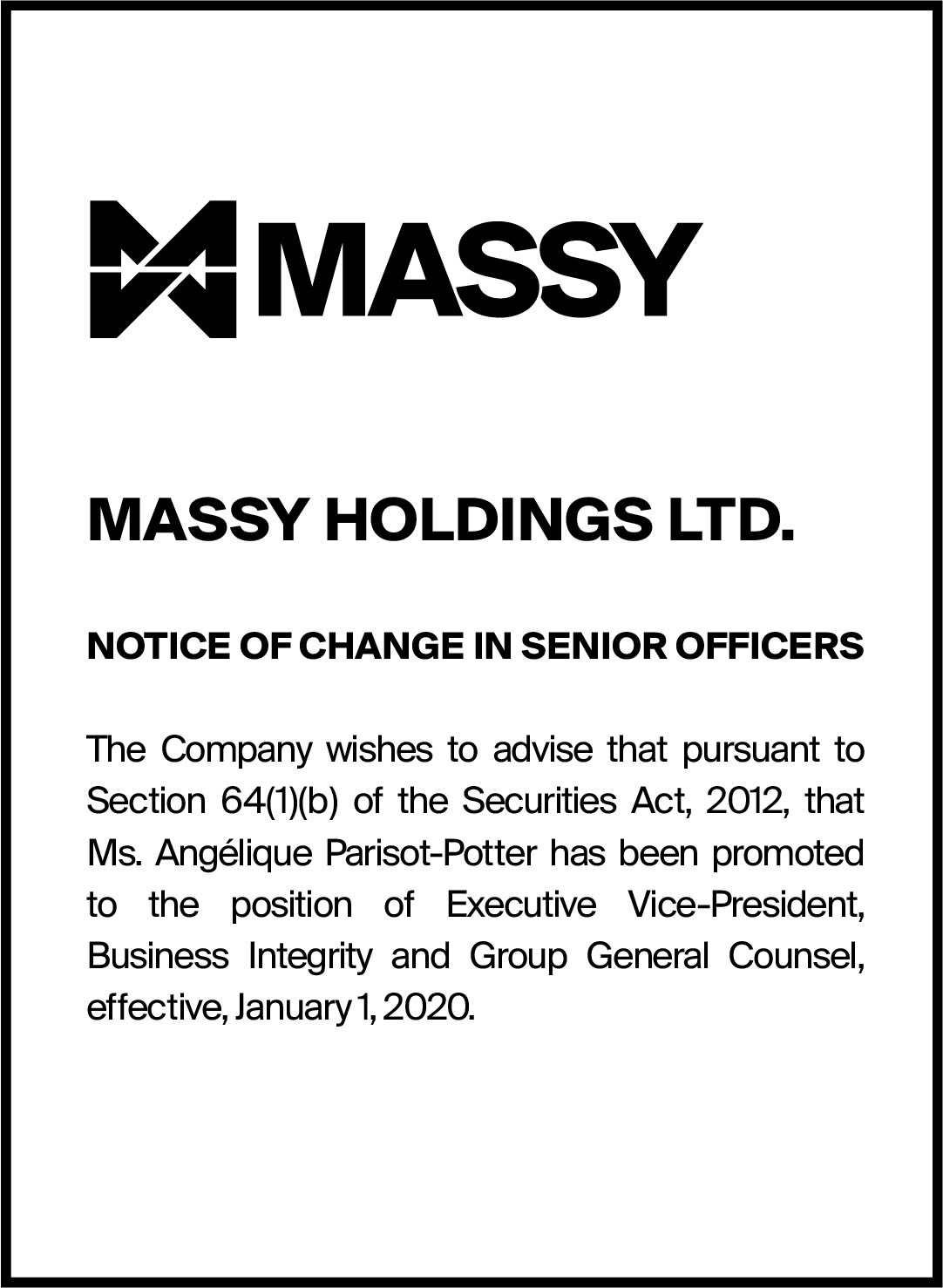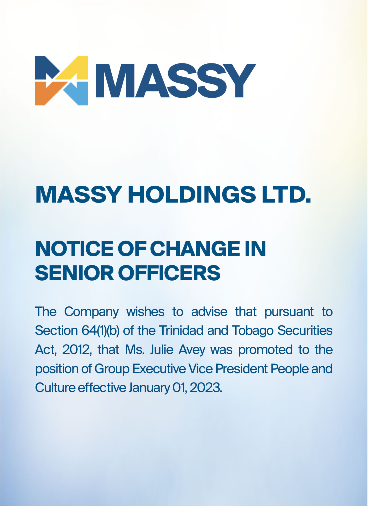 Massy Holdings Change in Senior Officer – Peter Graham
