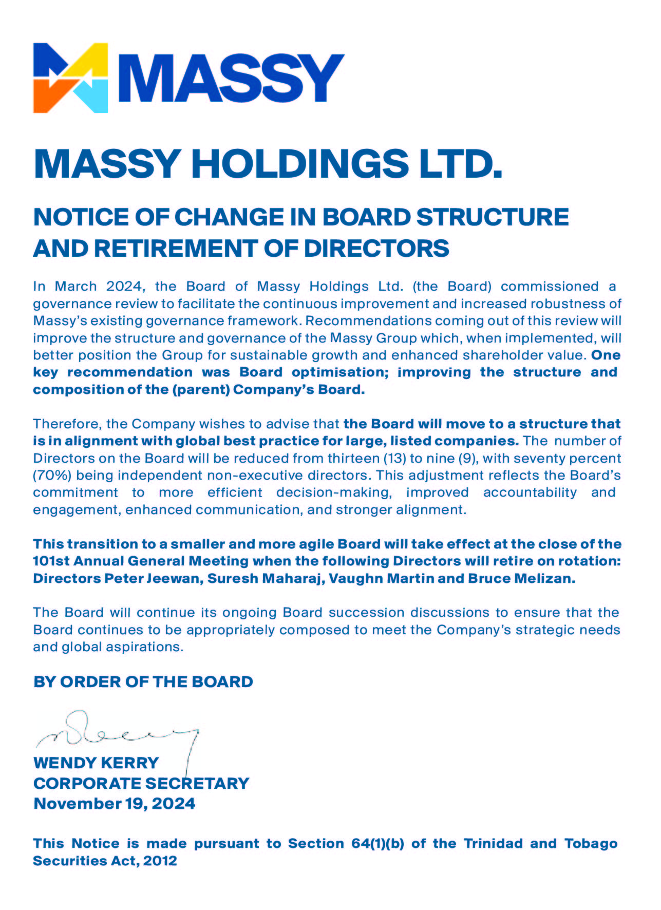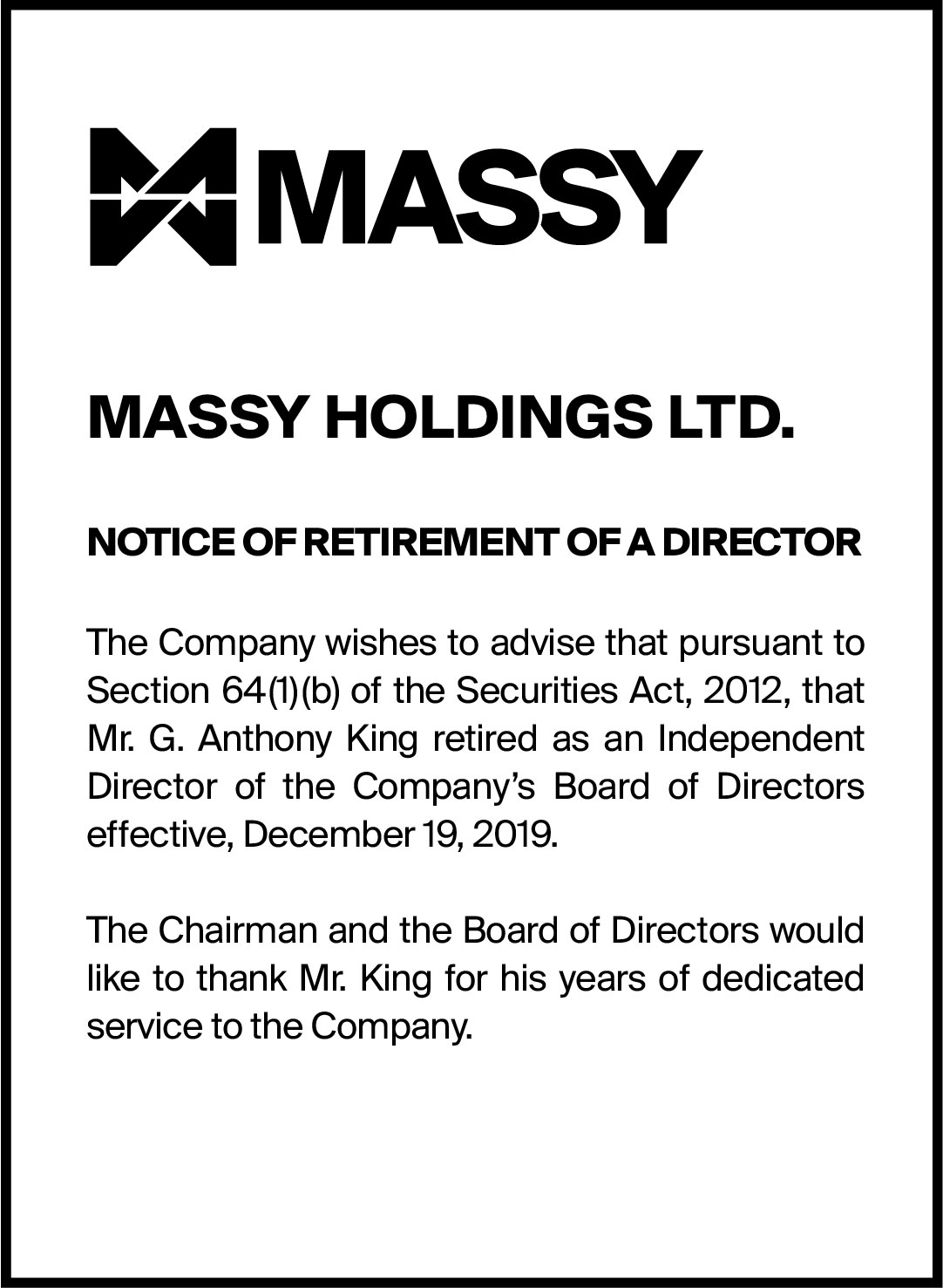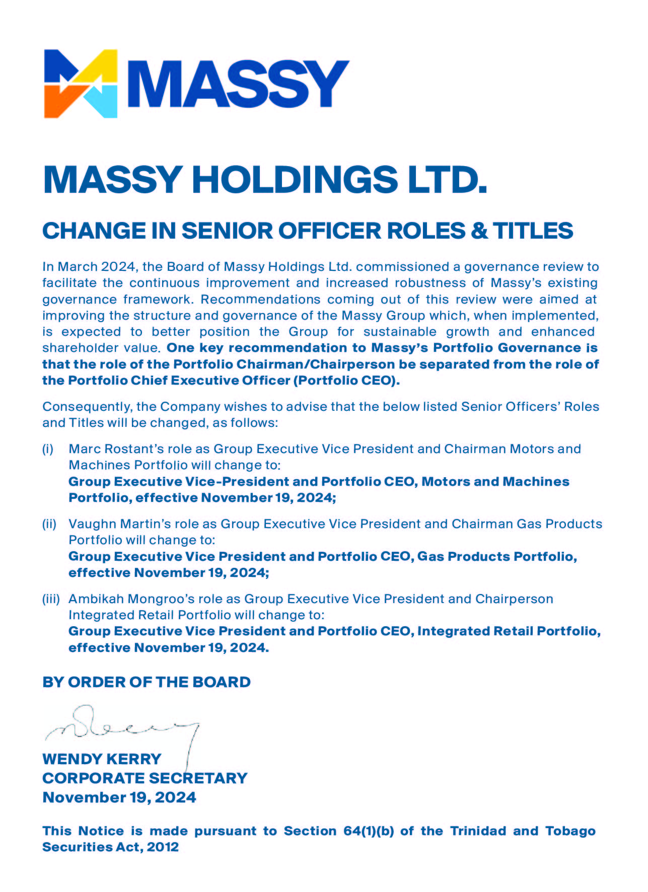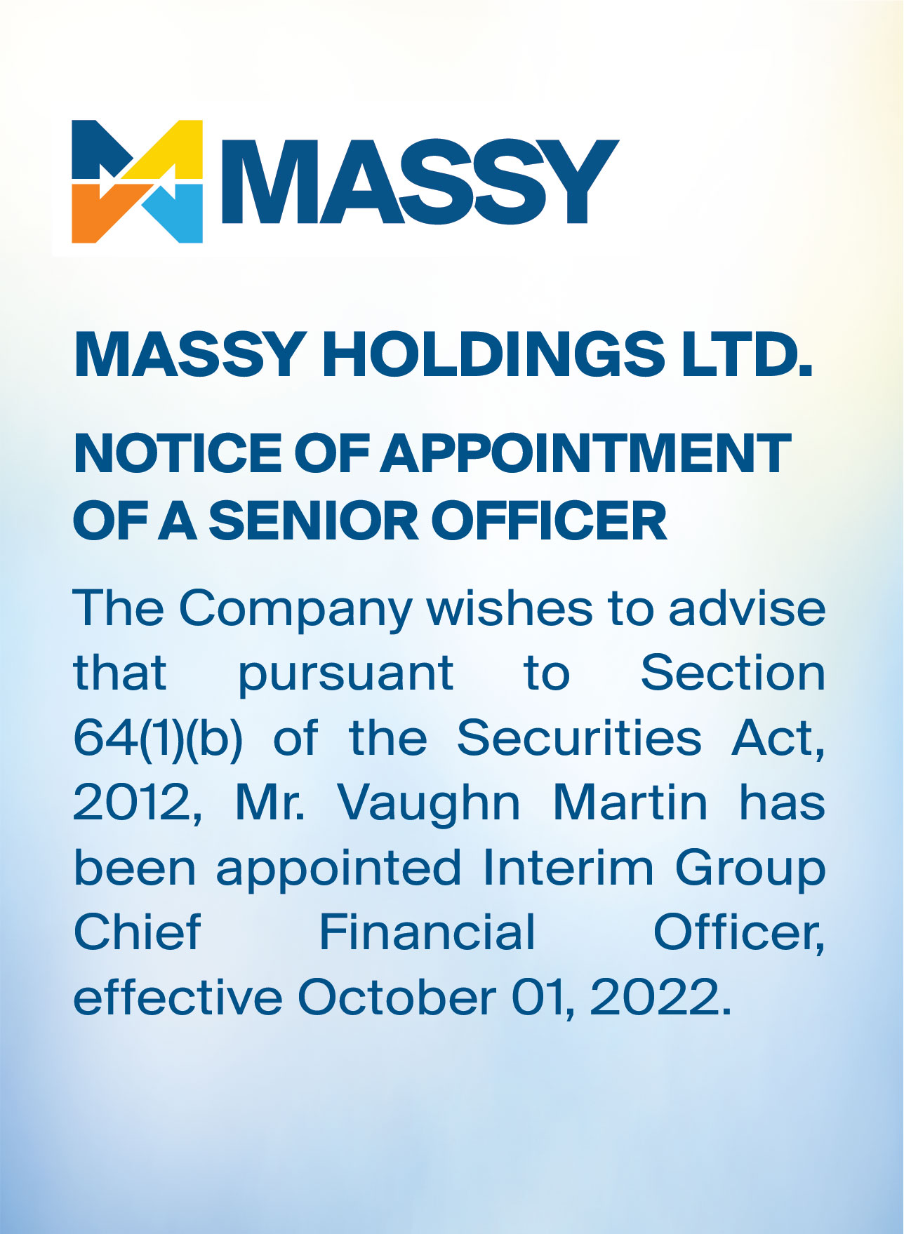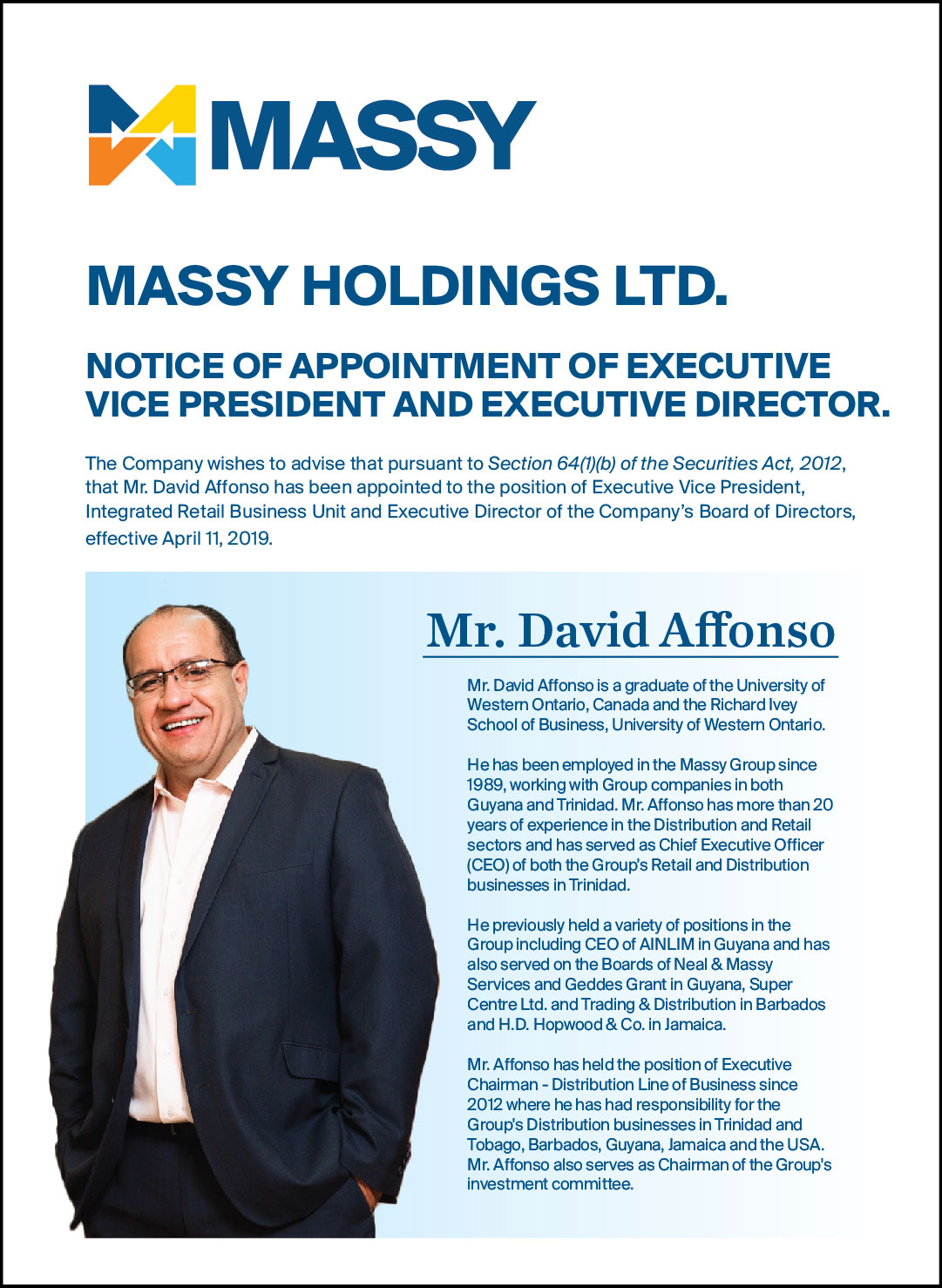 Massy Holdings Change in Senior Officer – Peter Graham