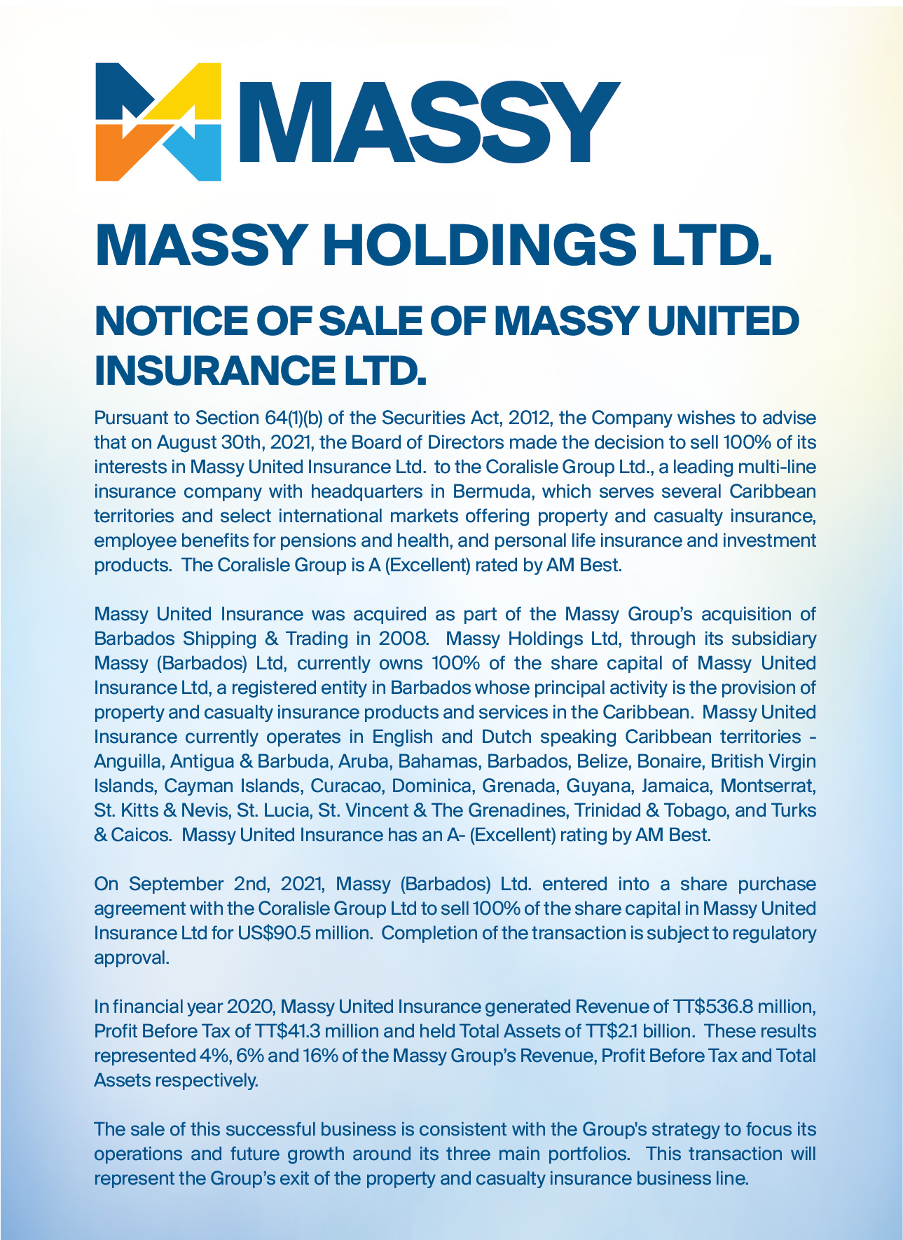 Notice of Sale of Massy United Insurance Ltd.
