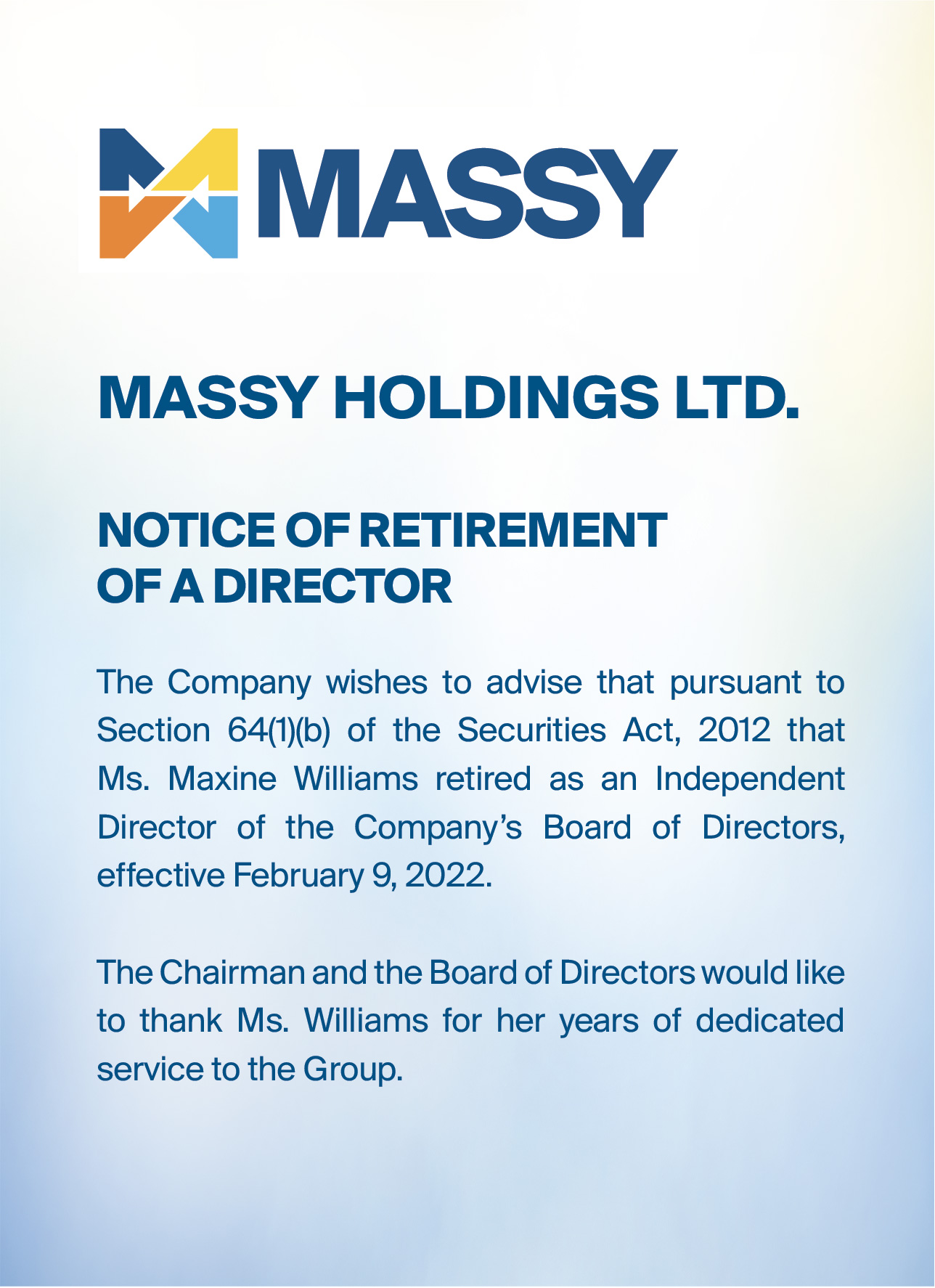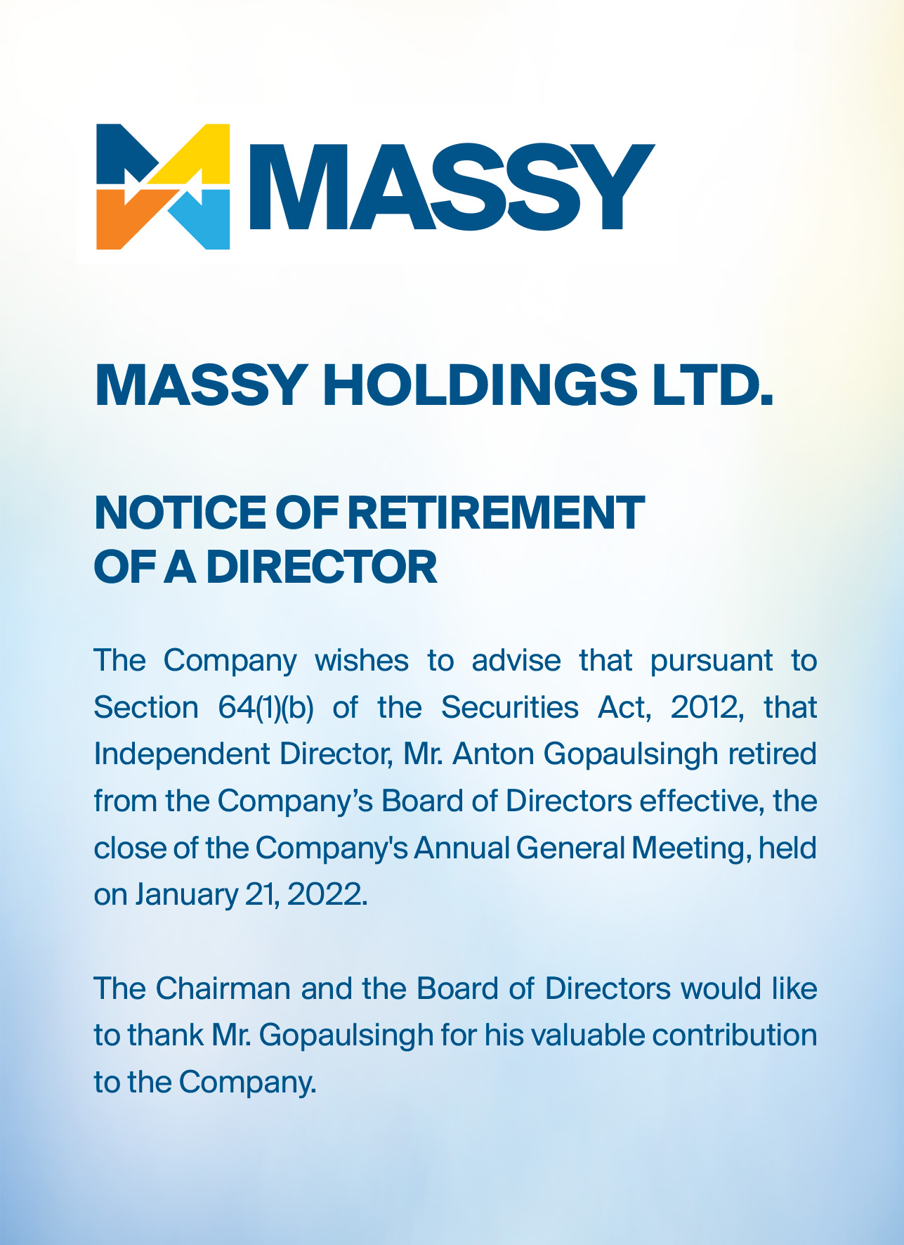 Notice of Retirement of a Director