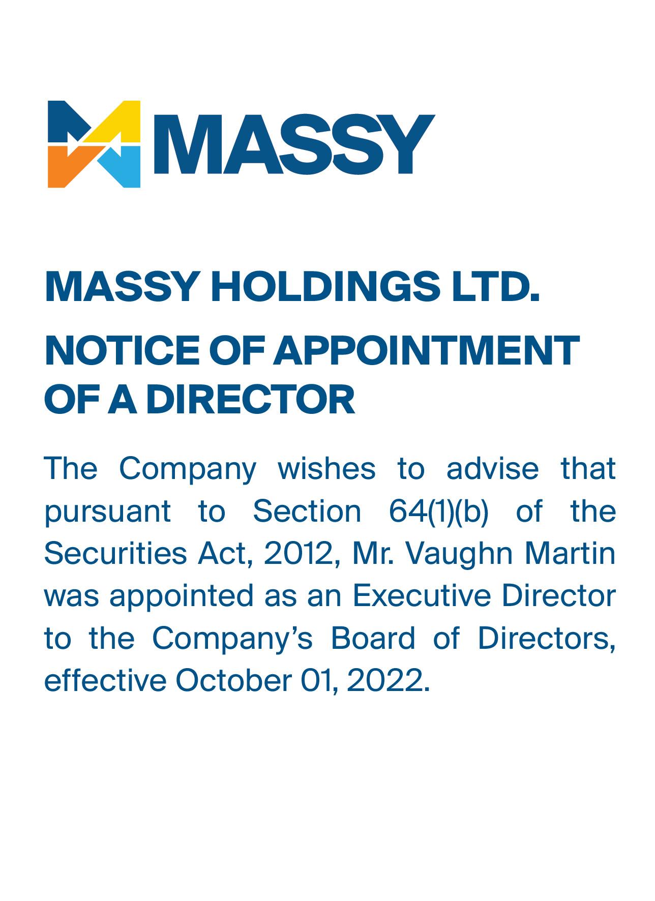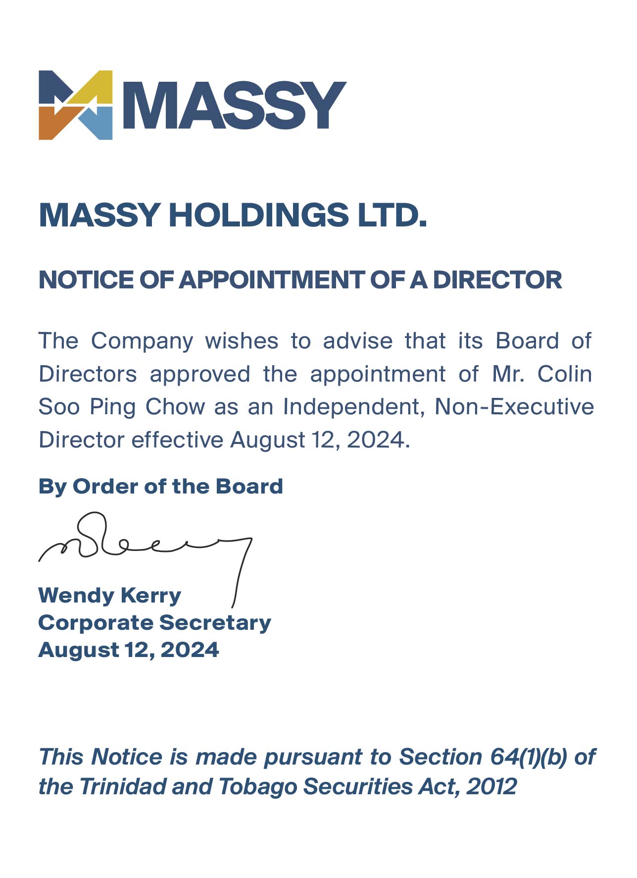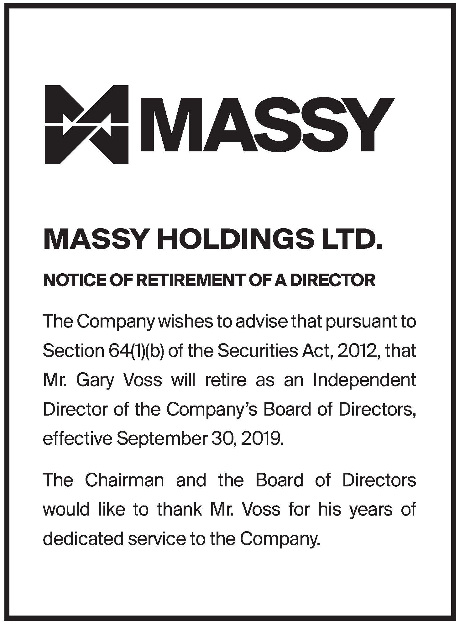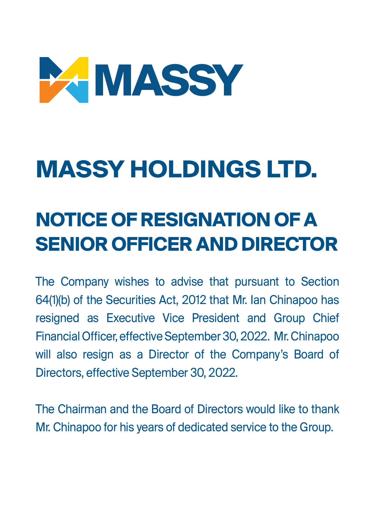 Notice of Appointment of Senior Vice President and Resignation of DirectorNotice of Resignation of Director from Massy Holdings Ltd.