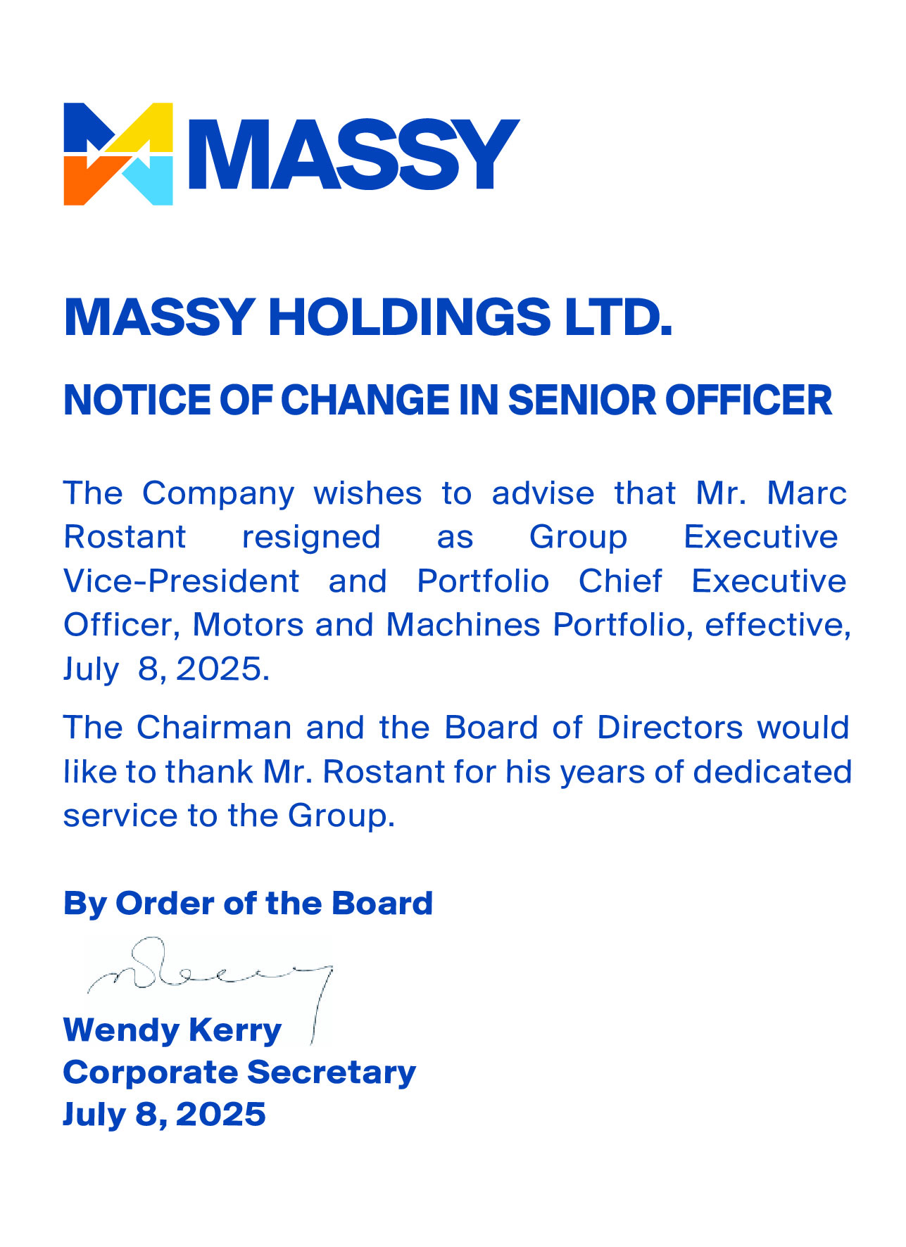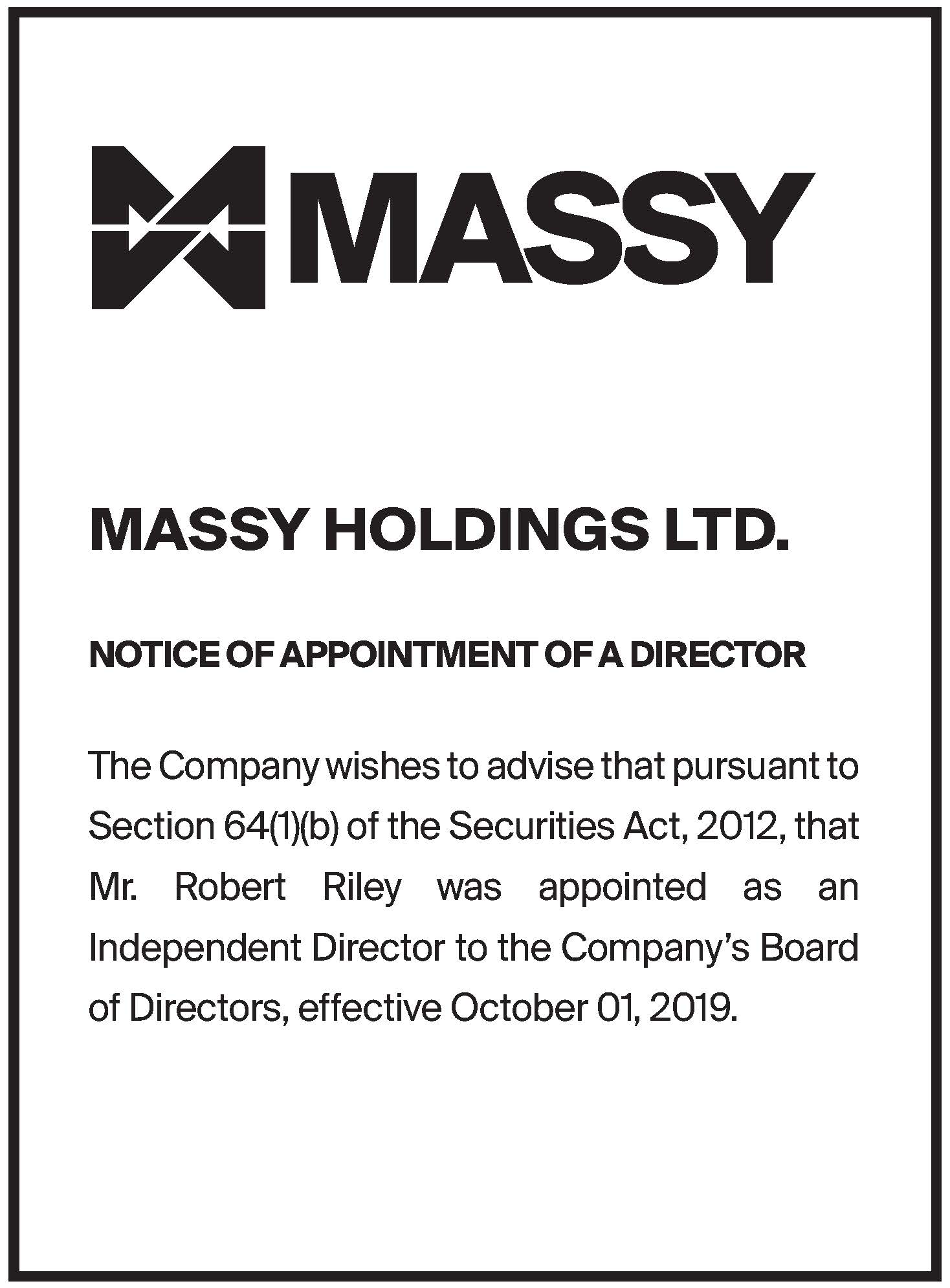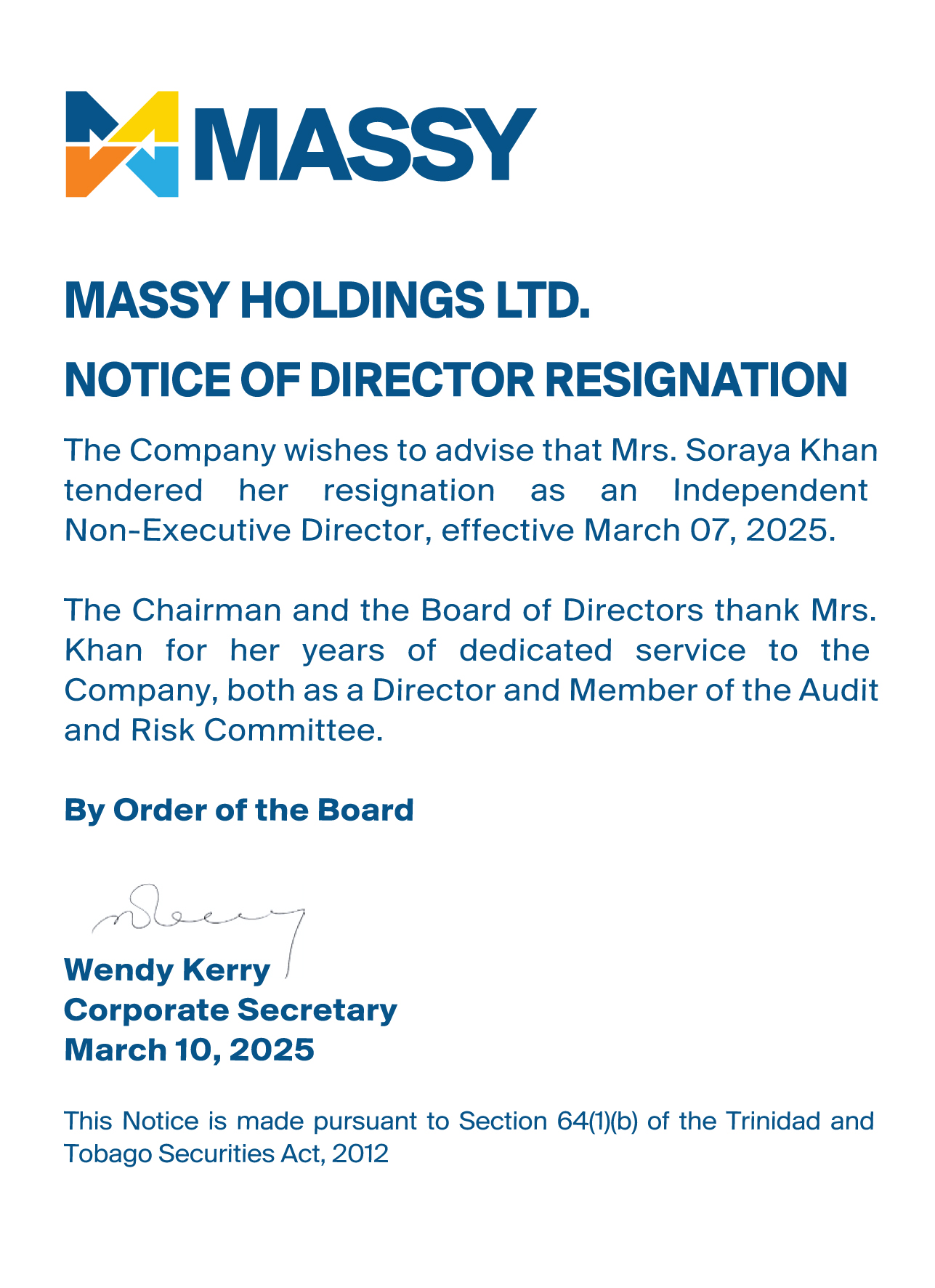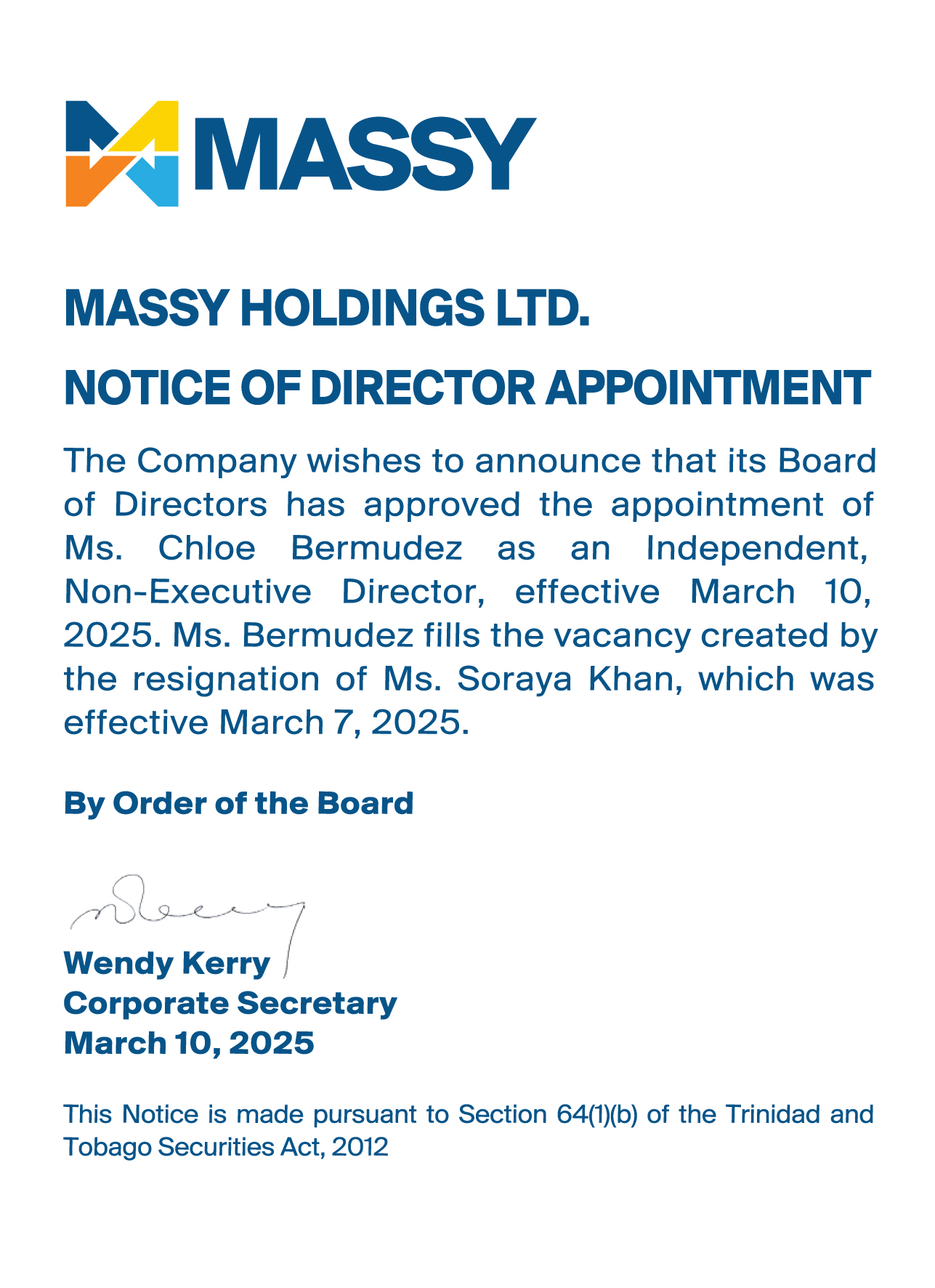 Notice of Appointment of Senior Vice President and Resignation of DirectorNotice of Resignation of Director from Massy Holdings Ltd.