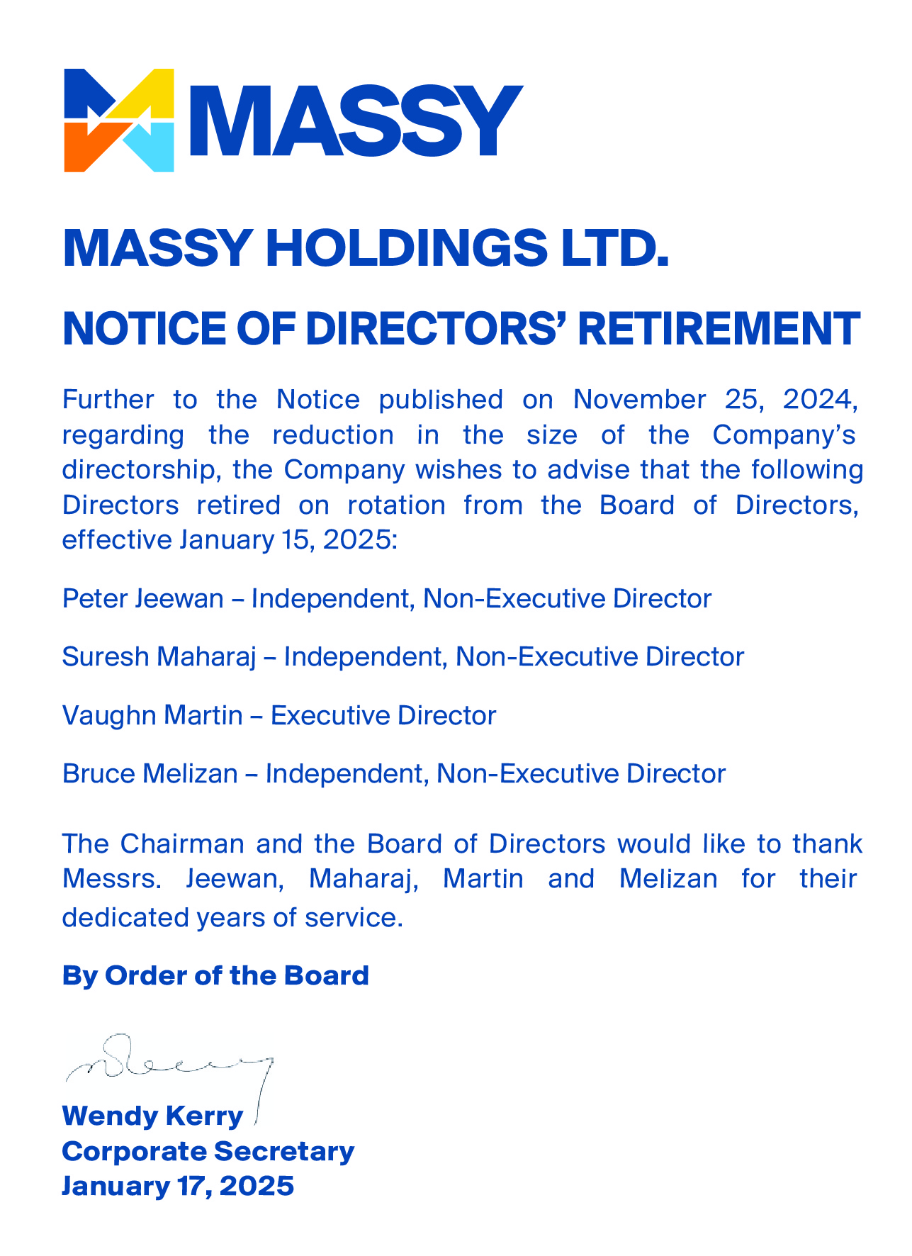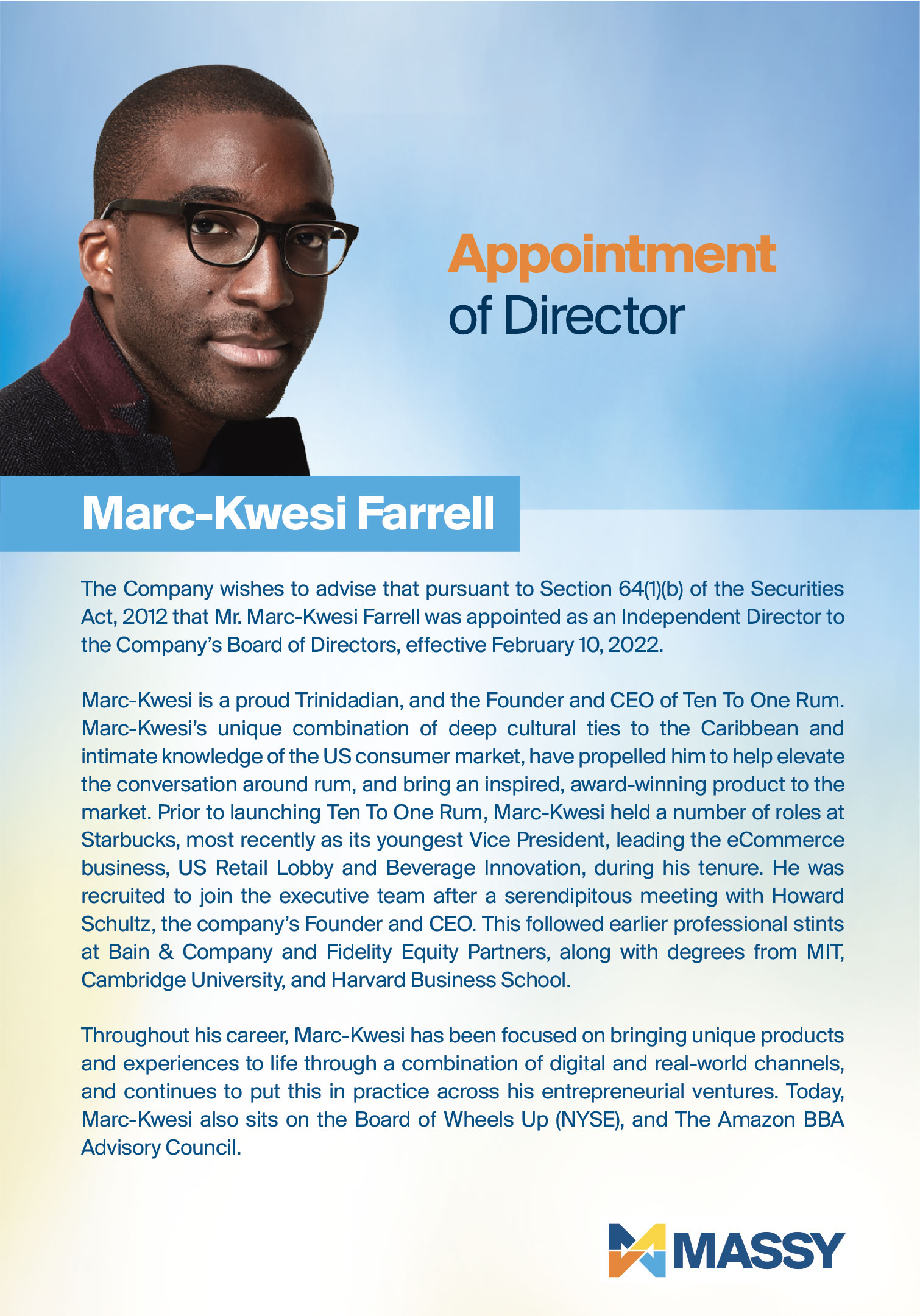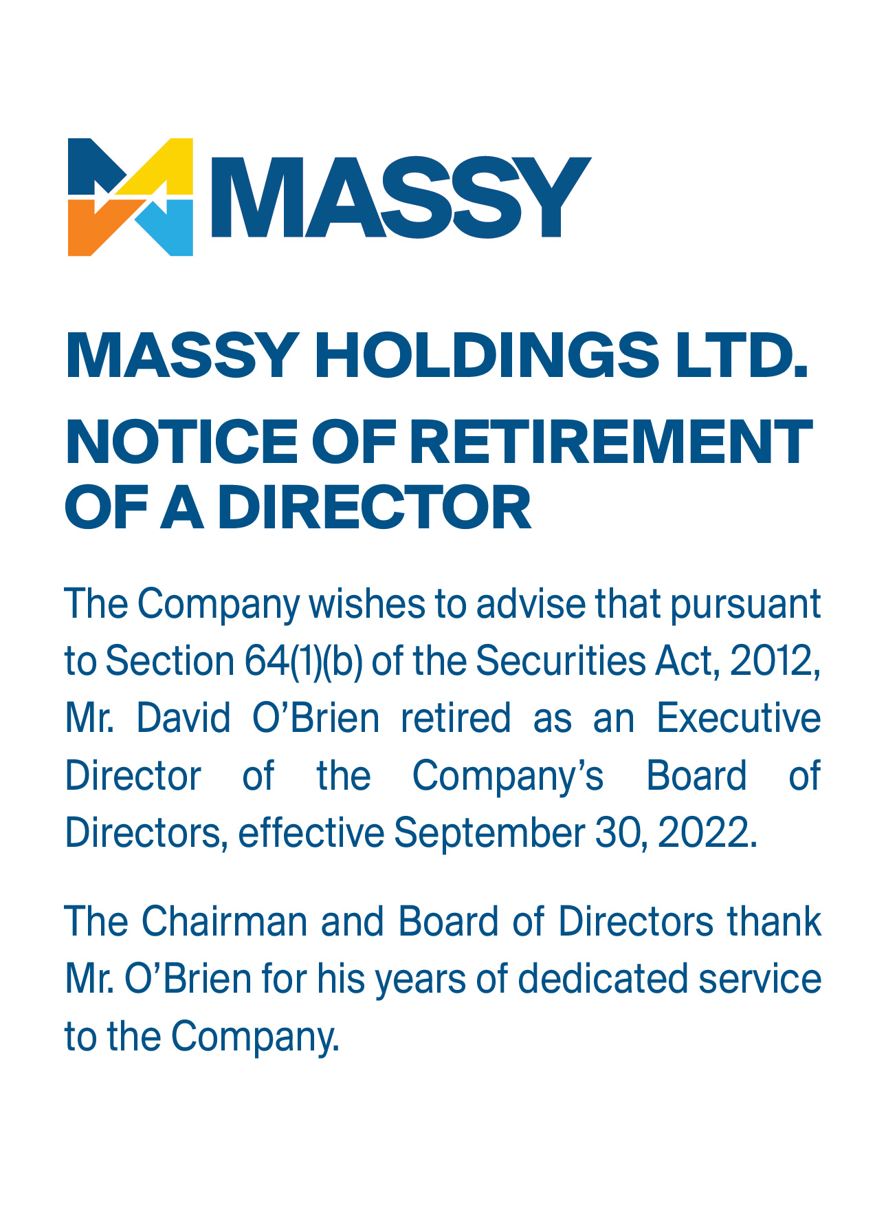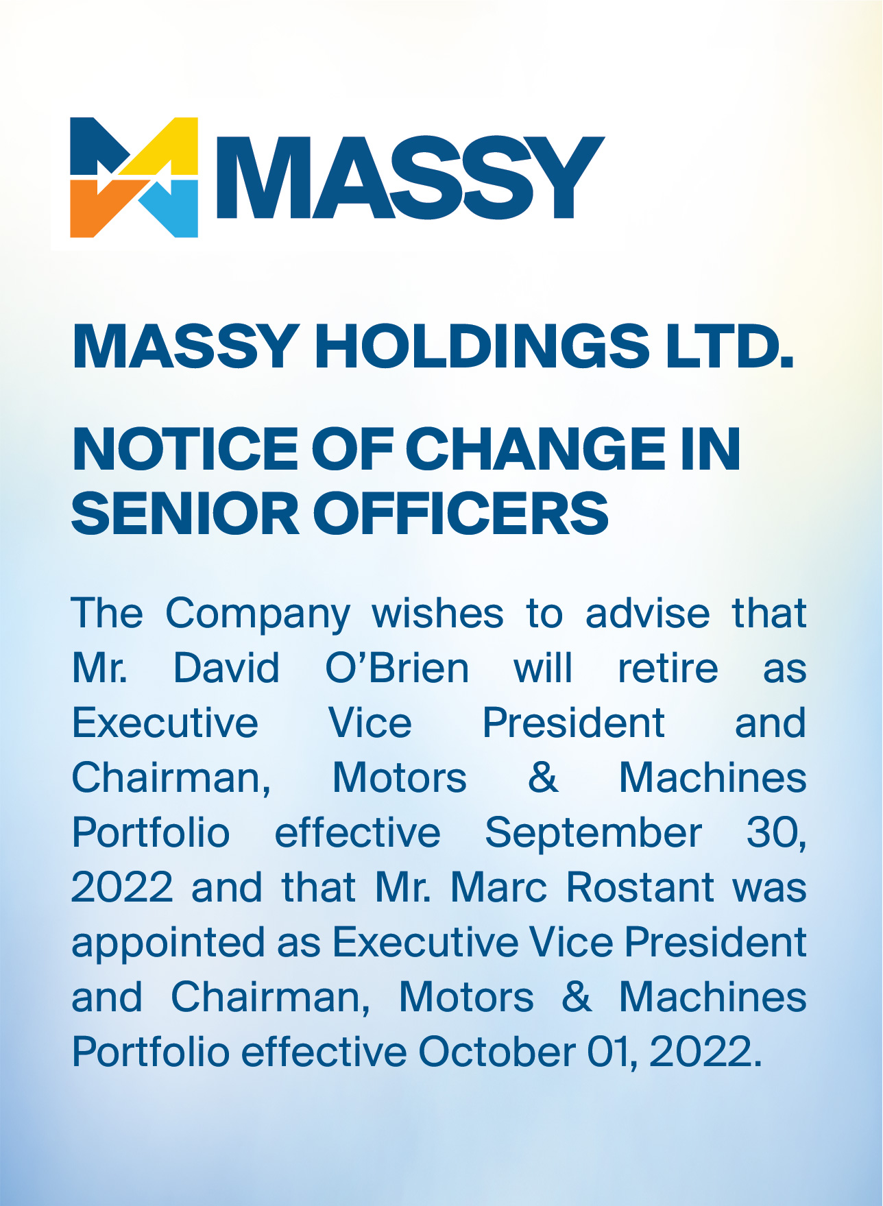 Notice of Appointment of Senior Vice President and Resignation of DirectorNotice of Resignation of Director from Massy Holdings Ltd.