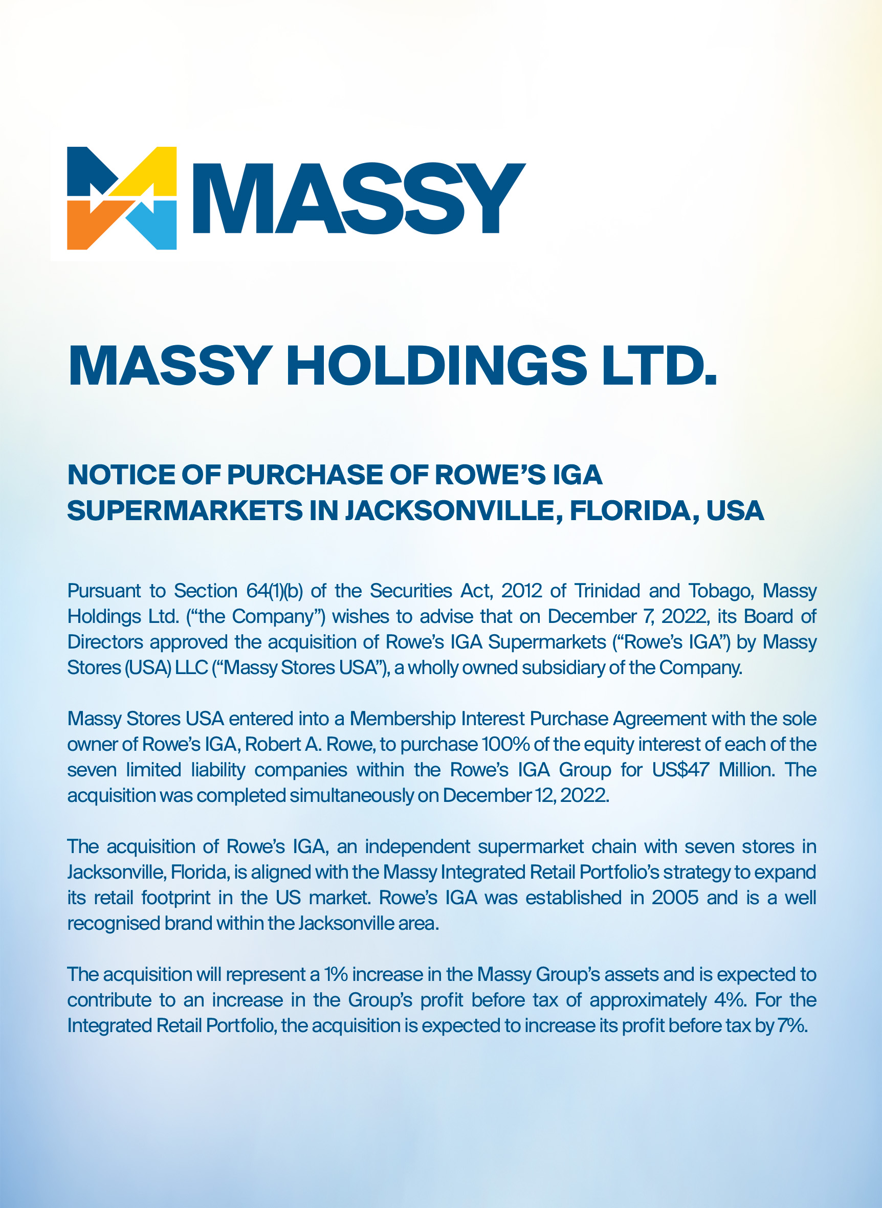 Notice of Purchase of Rowe’s IGA Supermarkets